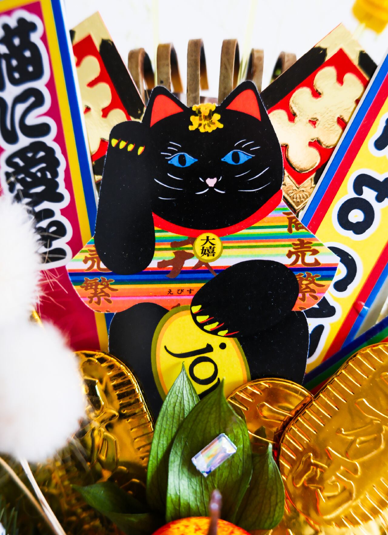 幸福を呼ぶ黒猫を真ん中に、猫の幸せを祈願するハッピー熊手。
