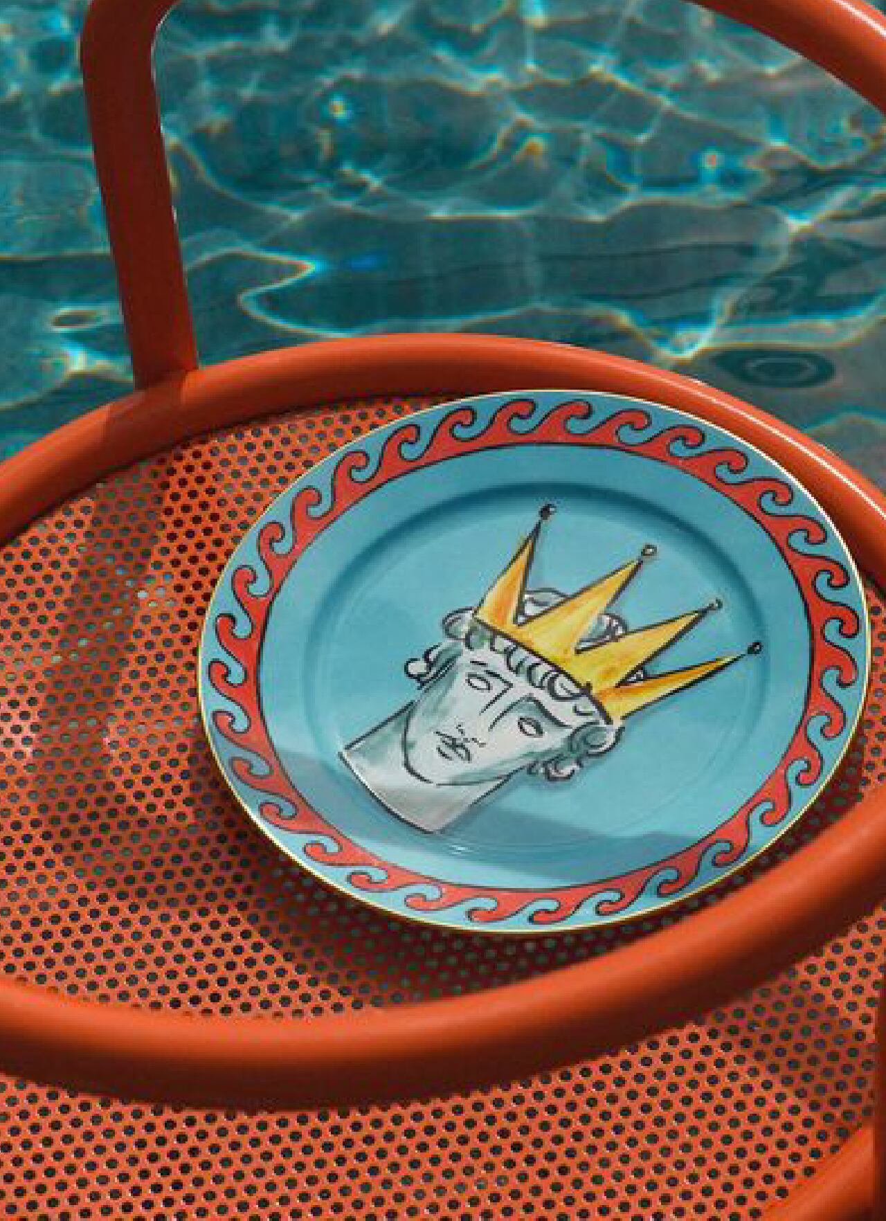ロンドンを拠点として活躍する気鋭のデザイナー兼アーティスト、ルーク エドワード・ホールの古代ギリシャ・ローマ神話への深い愛にインスパイアされたコレクション。 神話の堅苦しさを排除しつつ、海の神・ネプチューンを主人公に、王冠、珊瑚、貝殻、そして古代のブロンズ像を彷彿とさせる頭部そして胸像などの個性的なモチーフが手描きのタッチで描かれ、ピンク、オレンジといったキャンディーのような大胆な色彩とともに装飾に用いられています。 遊び心のあるデザイン性と、熟練の技術に裏打ちされたクラフトマンシップの出会いが、生活に独創性と新鮮さをもたらし、ほかにはない、見たことがない世界への扉を開けるコレクションの創造につながりました。