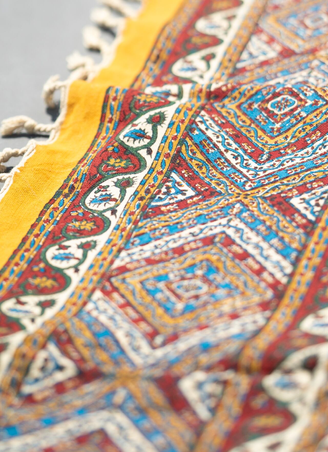 黄色のビビットのカラーとペイズリー柄の美しいデザインが、華やかな一枚。