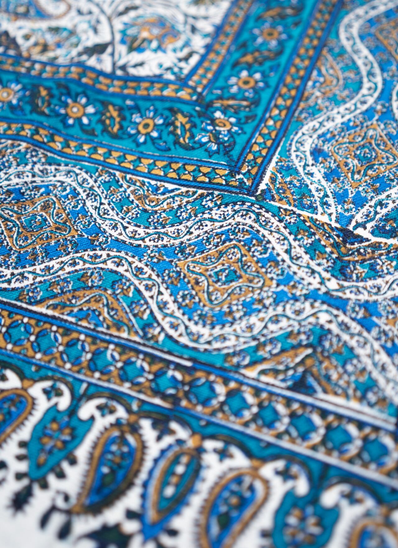 上質なインド綿素材を贅沢に使用した、手触りの良さが魅力のブルー柄ブランケット。