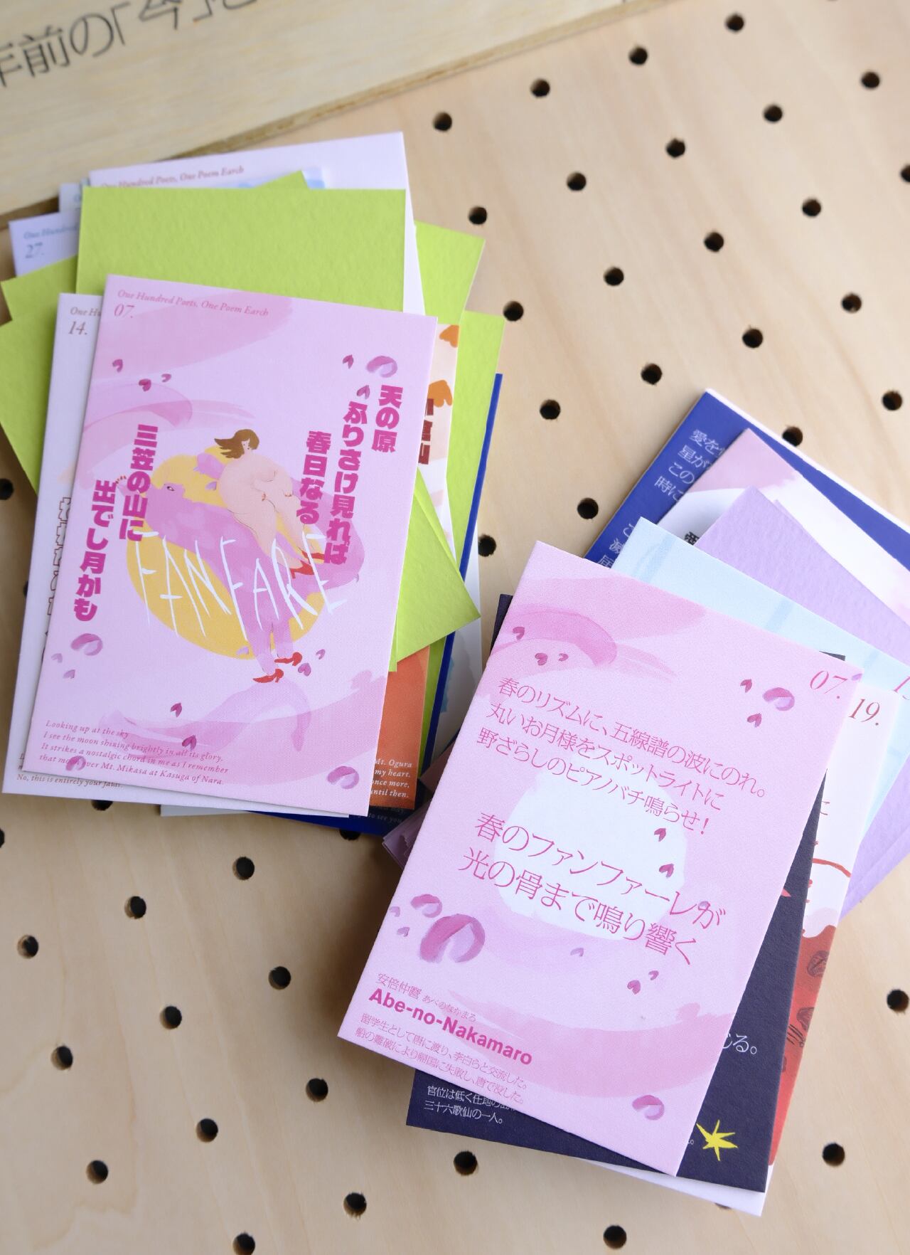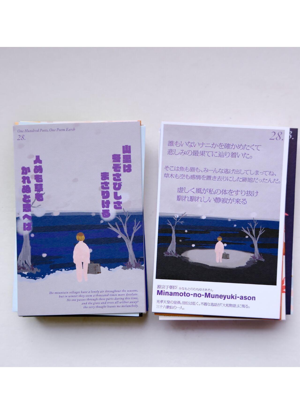 「ことばと絵で一千年前の「今」を謳う」をコンセプトに、一千年経っても風化されない人の感情や情景を、「今」のことばと絵に描き下ろしたオリジナル百人一首。 厳選された24種を集めた詩集カードのようになっており、本来の百人一首の和歌と、「今」のことばに書き下ろしたカードが対になっています。 百人一首とは千年前のJ-POPだと捉え、風化されない想いや季節の移ろいが表現されています。恋の歌、季節の歌、月を詠む歌、孤独の歌、さまざまな歌が収録されている感情盛りだくさんのカードセット。