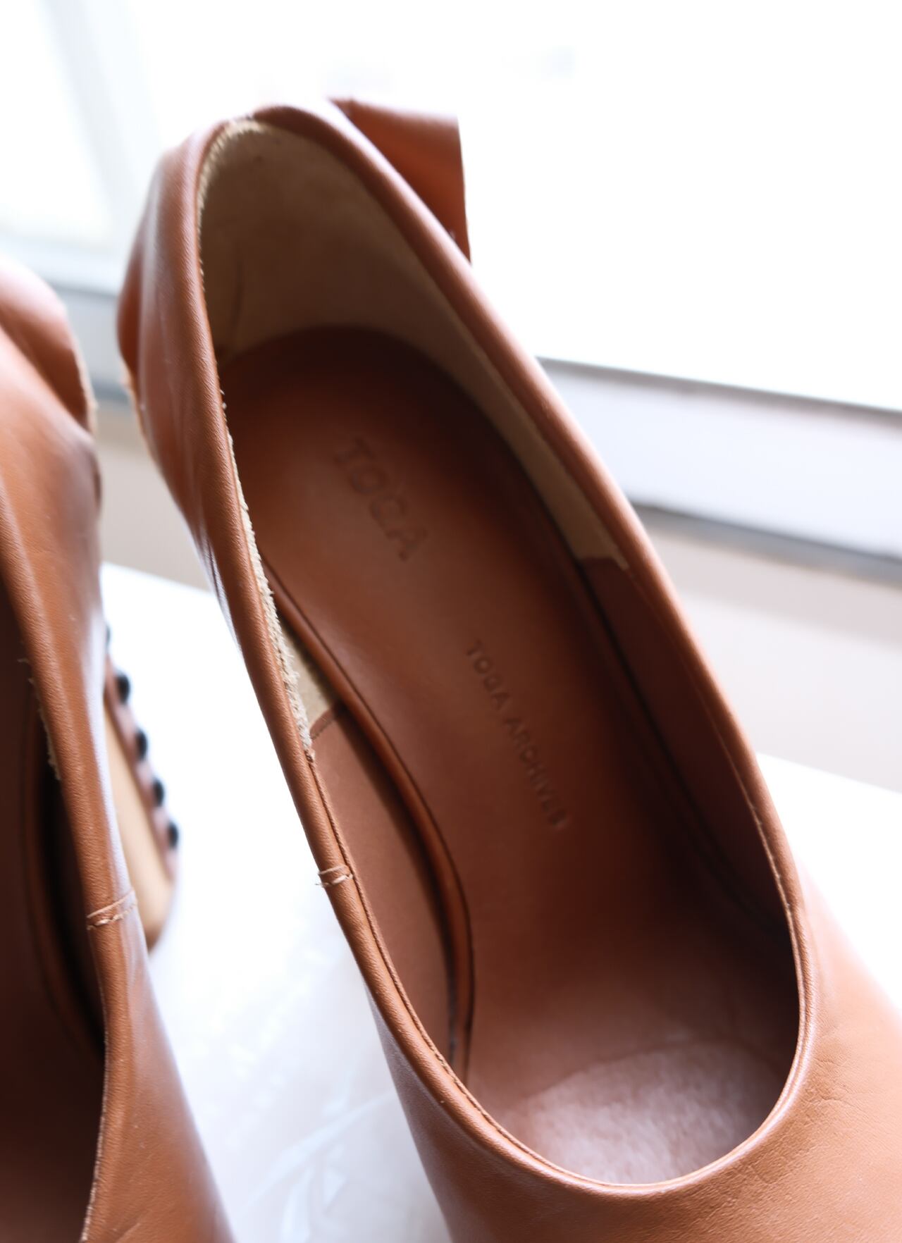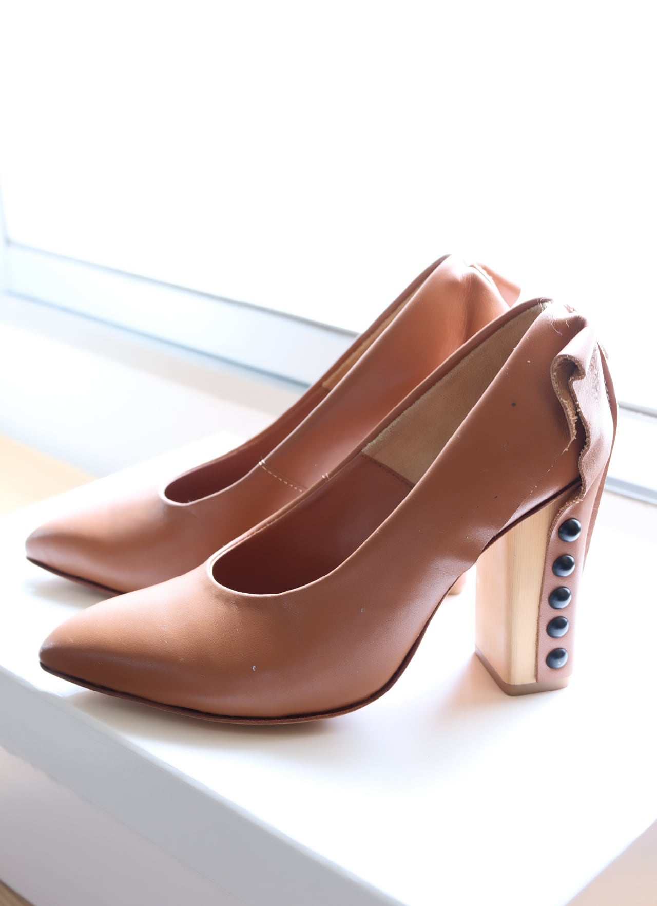 ヒール部分にボタ、足首バックにリボンのデザインが施されています。